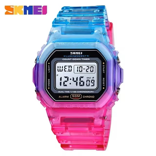 مشخصات اصلی رنگ صورتی آبیصورتی کم رنگقرمزمشخصات فرعی1قفل استیل بند PU2دو زمانه کرنومتر3نمایش روزهای هفته نور پشت صفحه4آلارم روزشمار