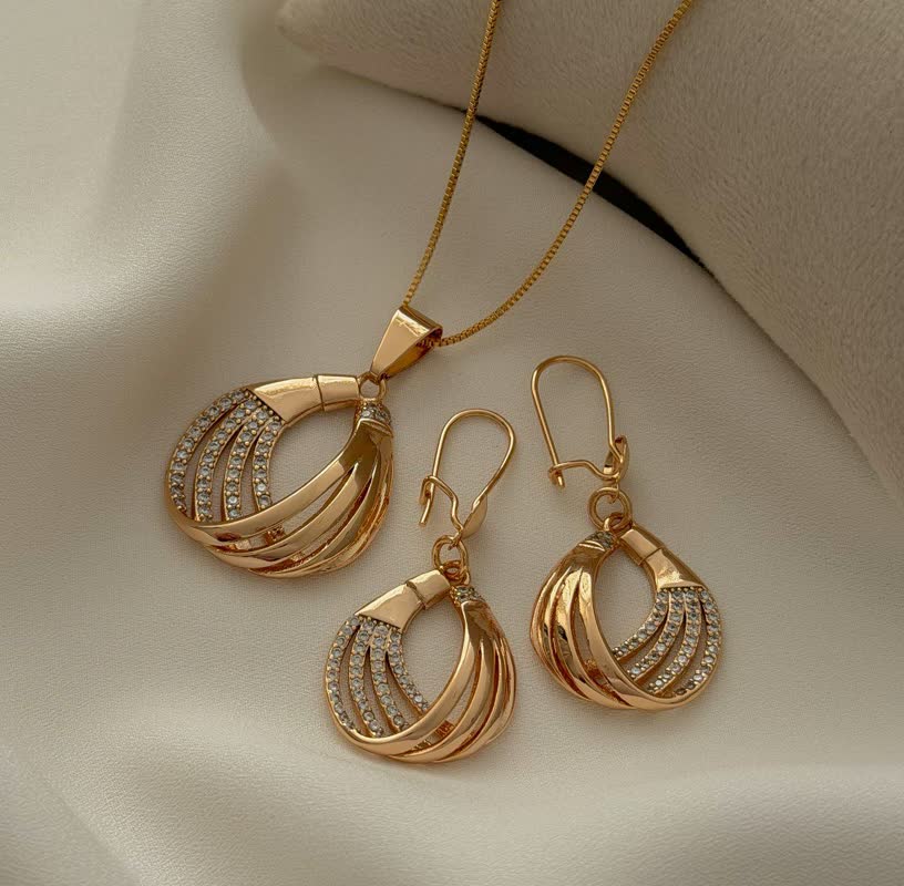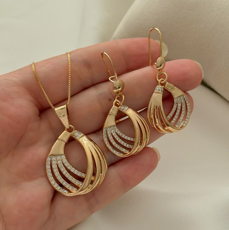 ویژگی های محصول برند:ژوپینگ رنگ:طلایی با آبکاری طلا 18 ارتفاع پلاک:3.5 سانت ارتفاع گوشواره:4.3 سانت قفل گوشواره:عصایی زنجیر:ندارد