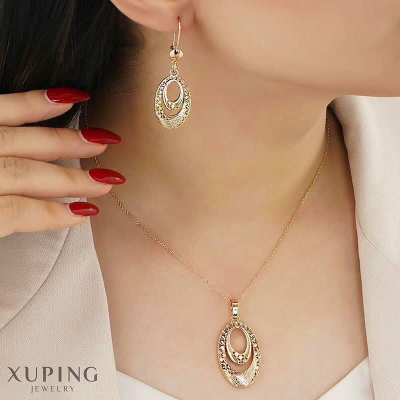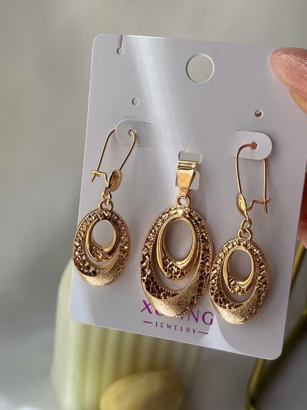 ویژگی های محصول برند: ژوپینگ رنگ: طلایی با آبکاری طلا 18 ارتفاع گوشواره: 4.4 سانت ارتفاع پلاک: 3.7 سانت